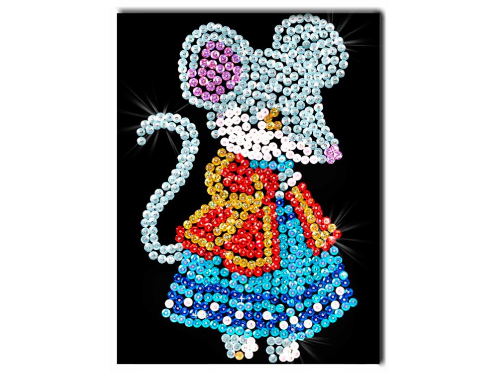 Эти варианты комплектуются яркими рисунками с изображениями героев мультфильмов (популярный вариант). На эту заготовку нужно прикрепить пайетки по схеме, то есть декоративными деталями заполняется не все поле картины, а только его часть (цветочки, листочки, немного фона и т. д.)