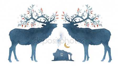 Акварельные силуэты оленей с Волшебные рога, север, магия, собака выросла, ветки, Луна, Полумесяца, СКАНДИНАВИЯ, Северная, красная индейцев, родного американского, Аляска