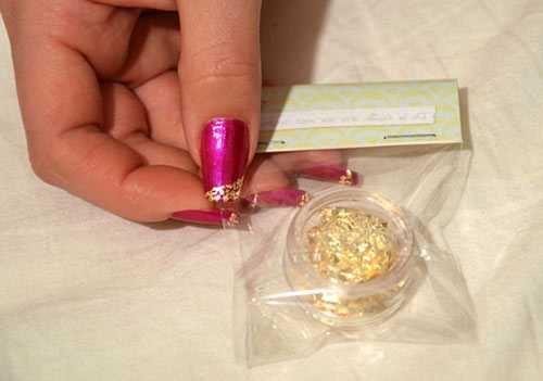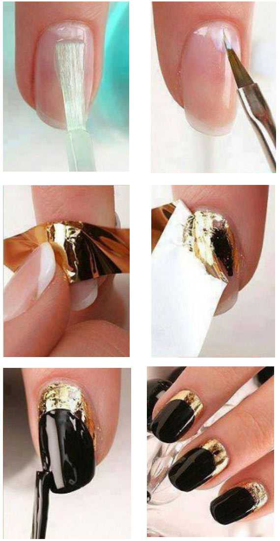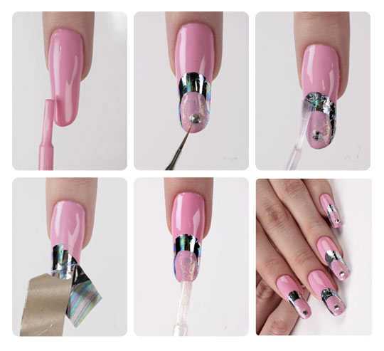 Или можно заранее подготовить маленькие кусочки фольги и наносить на ногти, как показано ниже: