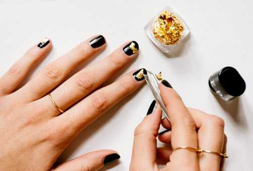 После стандартной процедуры можно клеить на ноготь фольгу, используя бесцветный лак, а лучше специальный клей, на котором она будет дольше держаться.