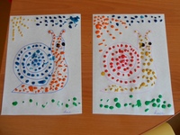 Начало знакомства с данной техникой происходит в процессе дорисовки своего рисунка: падающий снег, глазки у животных, цветочки на полянке и т.