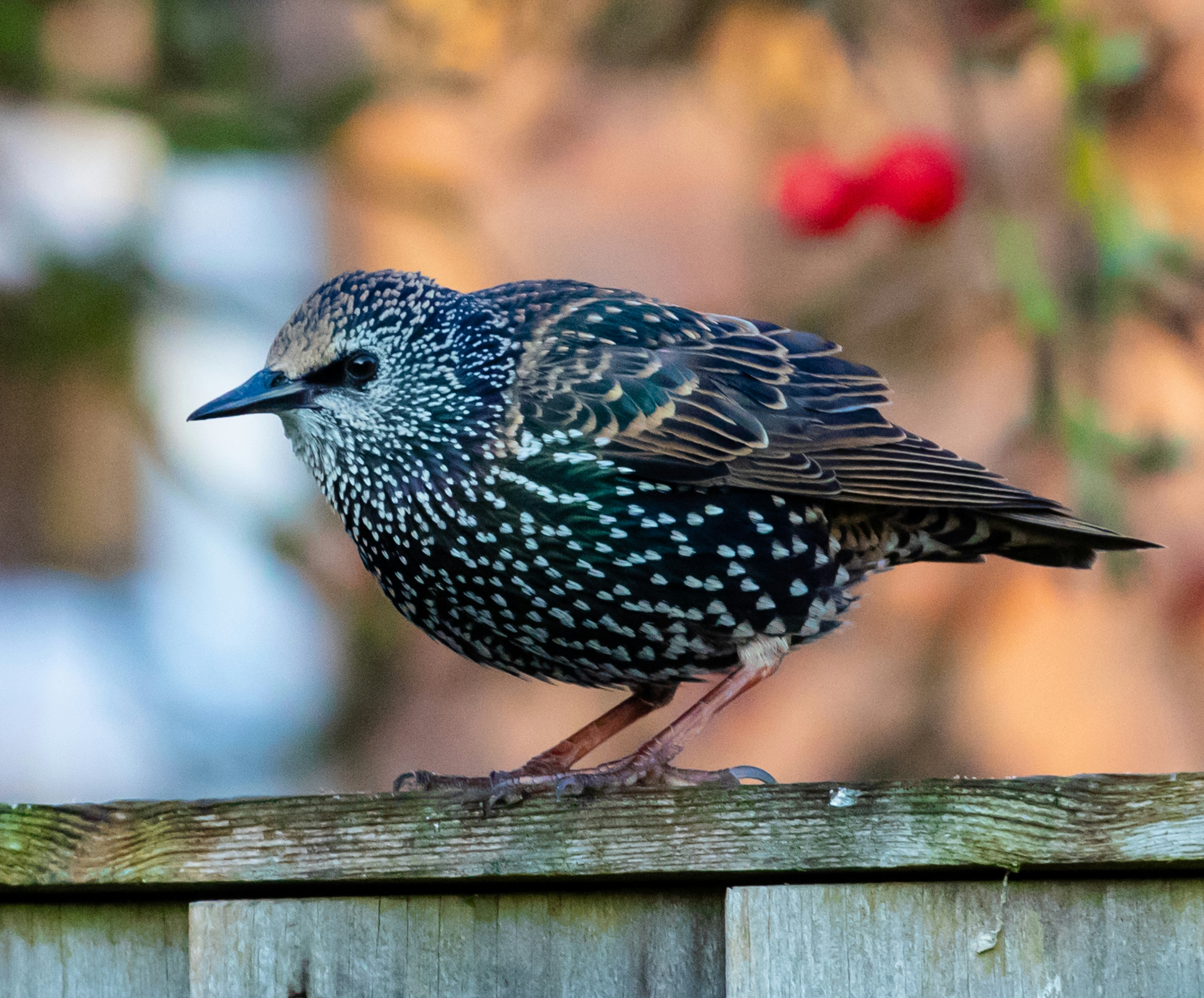 Мой любимый : Да, европейский Скворцы – не самая любимая птица в Соединенных Штатах.Но Вы не можете отрицать, что это действительно красивые птицы с правильным оперением и светом. Фотография ниже – европейский скворец с зимним оперением, питающийся плодами. восточного красного кедра с великолепной осенней листвой, окрашивающей задний план.
