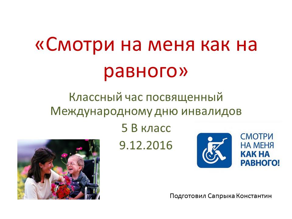 Учитель: В 1992 году Организация Объединенных Наций приняла решение о праздновании Международного дня инвалида. Обычно в этот день принято привлекать внимание к проблемам инвалидов, к защите их достоинства, прав и благополучия (слайд 5)