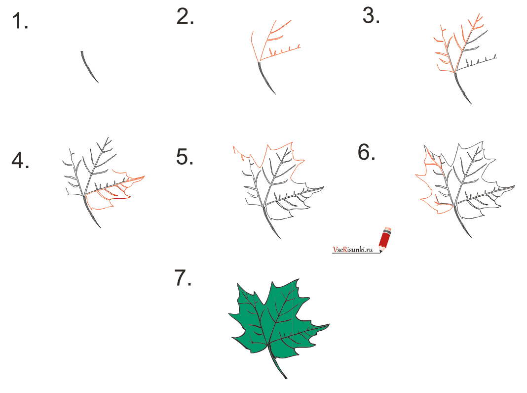 Прежде чем узнать, как научиться рисовать кленовый лист , разделим рисование на этапы.