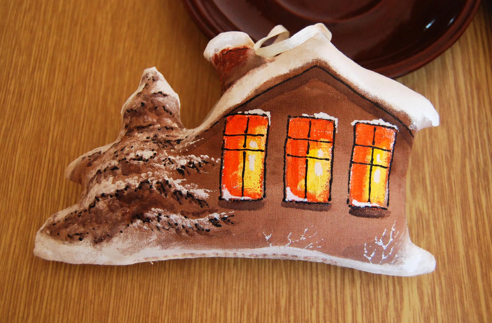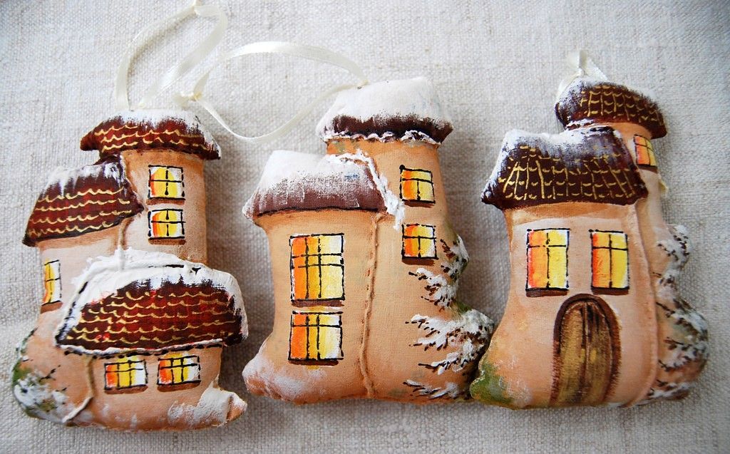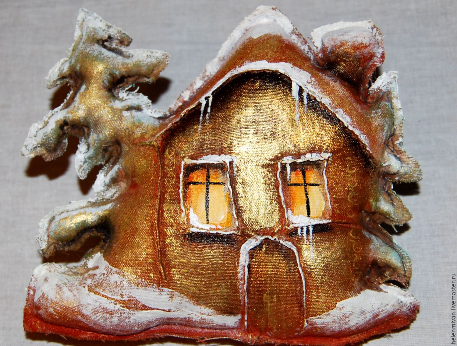 Краска высохла, кроим из мешковины кусок, которым затем обернем домик.