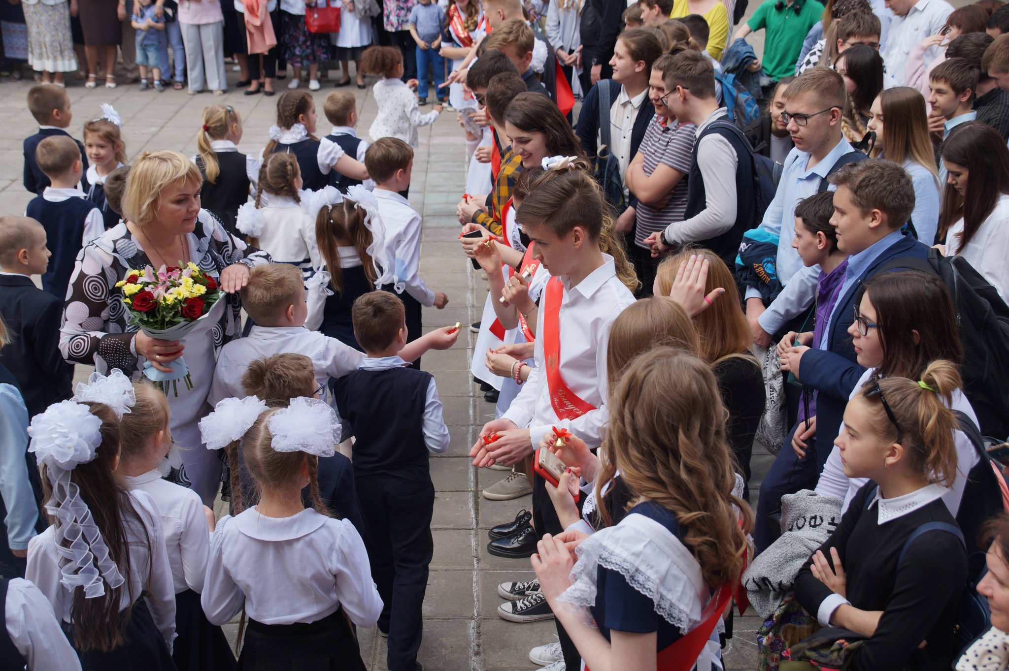 Ученикам 11 класса предложите развлечение, показывающее как они узнали друг друга за одиннадцать лет, проведенных вместе? Если соревноваться будет одновременно несколько классов, предложите капитанам (выбранным от каждого класса) «найти своих» с завязанными глазами по какому-либо признаку (произнесенный звук А, или пощупав прическу, сумку, часть одежды). Внутри одного класса можно узнавать друг друга по единственной части тела (палец, рука, нога, ухо, локон волос). Практика показывает, что такое развлечение со смехом вспоминается еще несколько дней после первого звонка.