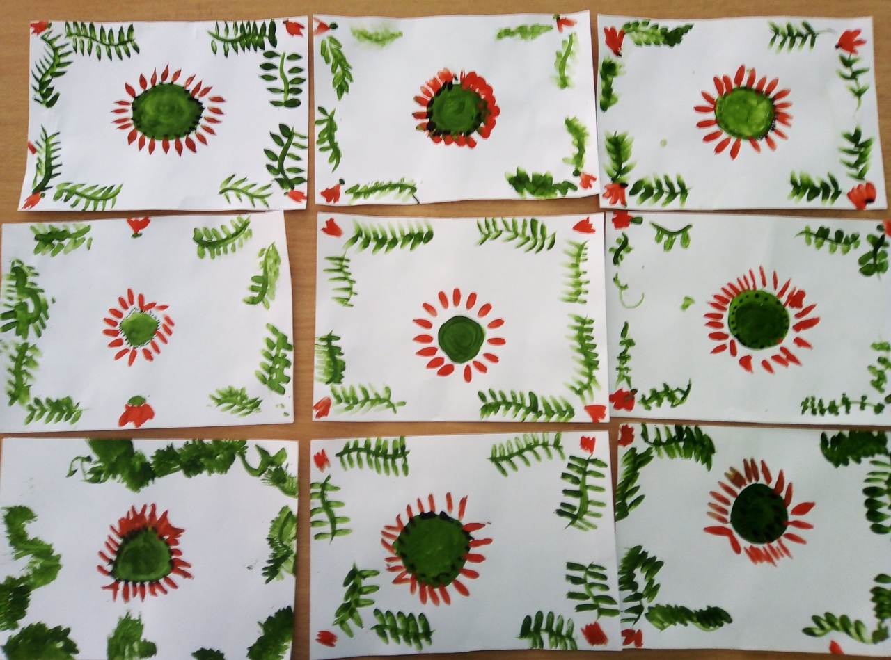 Далее проводится самостоятельная работа детей (составление узоров из ромашек на «платочках»).