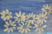 Воспитатель:-Обратите внимание, рисунок на платочках расположен по разному. (по всему платочку, по углам, по контуру). Мы с вами тоже будем выполнять на платочке узор из ромашек. Посмотрите, как это буду делать я. Сначала мы нарисуем ромашку в середине квадрата, затем по углам. Начинаем рисовать цветок с цветоложе с помощью кончика кисти. Затем способом примакивания, рисуем лепестки ромашки симметрично: вверху над серединкой, внизу напротив, затем слева и напротив справа, а потом между ними. (параллельно воспитатель демонстрирует рисование цветка на доске).Но сначала, я предлагаю вам размять свои пальчики.