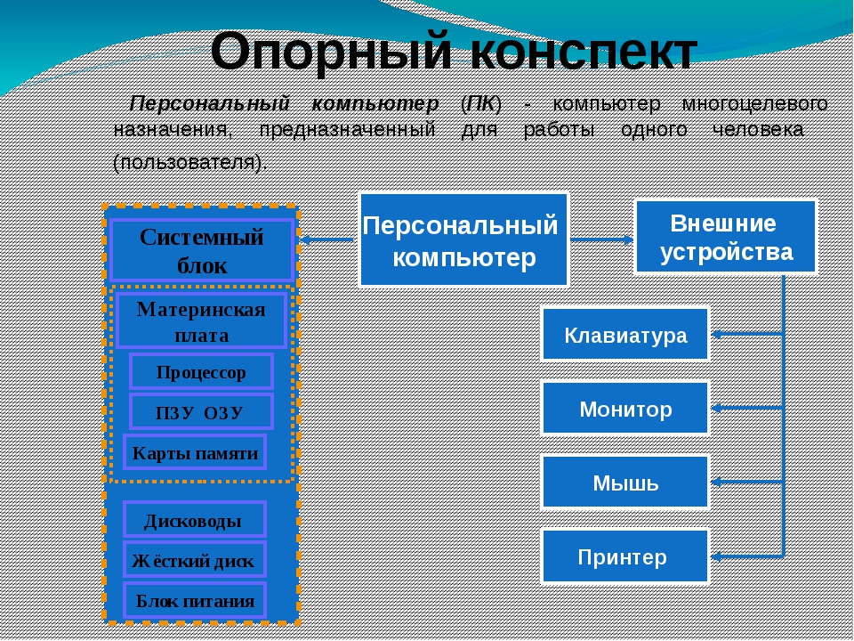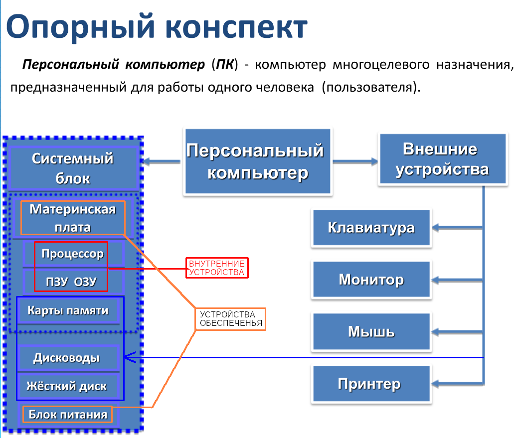 Предметные: Знать назначение компьютера, базовую структурную схему компьютера, понятие аппаратного обеспечения компьютера, назначение, основные характеристики и физические принципы организации устройств (микропроцессора, устройств ввода-вывода, устройств внешней и внутренней памяти, системной шины, портов, слотов), принцип открытой архитектуры компьютера.