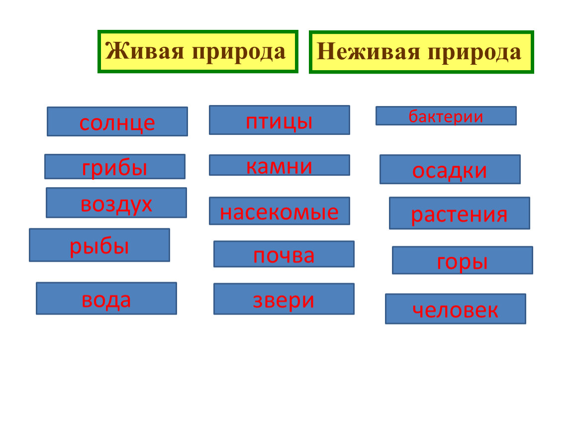 – Что к ней относится? – К неживой относятся вода, воздух, земля, солнце, небо.