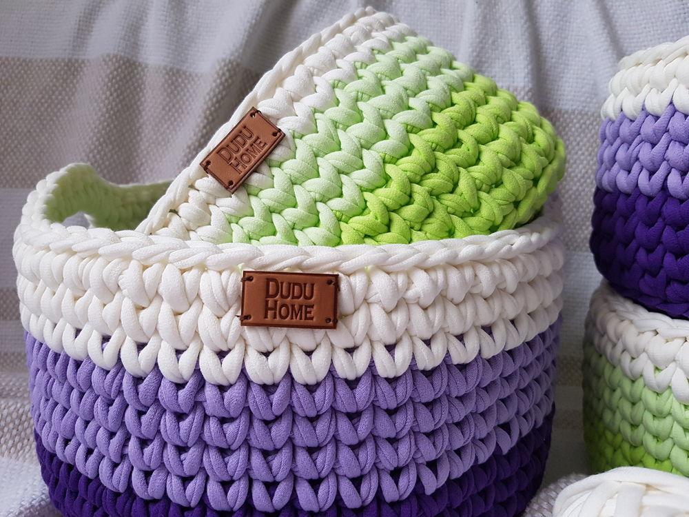 Корзинка из трикотажной пряжи, связанная узором галочки