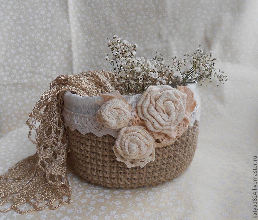 Корзины, вязаные крючком, найдут своё применение на кухне и в гостиной. В них можно ставить цветы, держать под рукой журналы или книги.