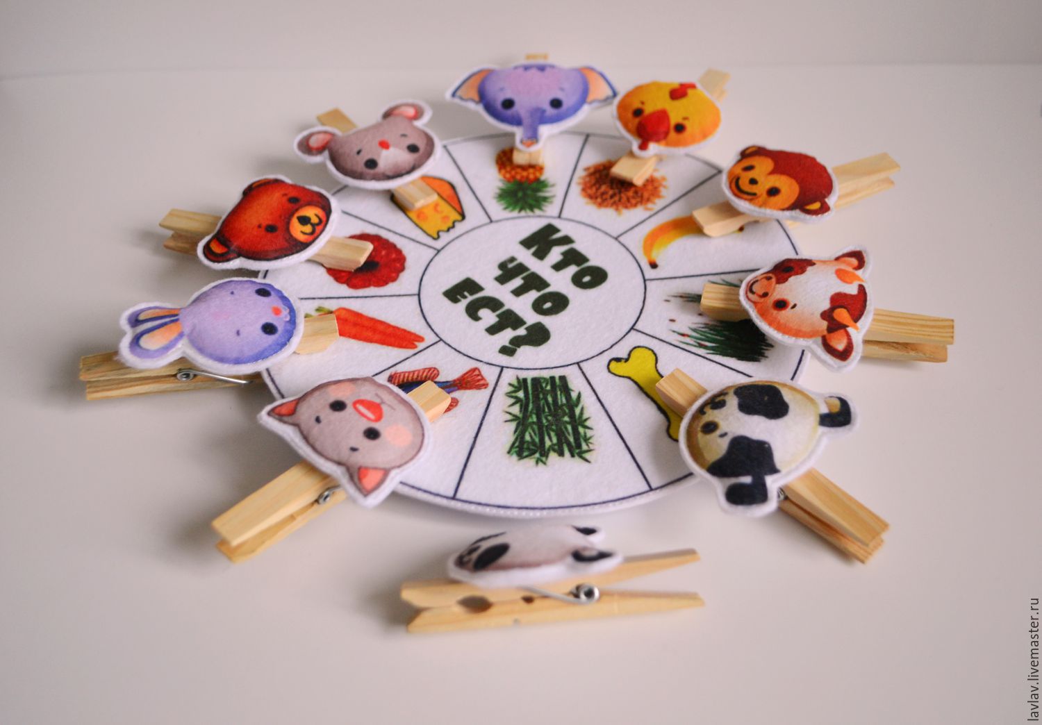 Ход игры: ребёнку предлагается прикрепить прищепки с мордочками животных на круг таким образом, чтобы обозначить соответствие животного и вида пищи.