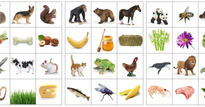 Взрослый: выберите для каждого животного его любимое лакомство. Как вы думаете, кому какая еда нужна?