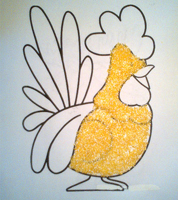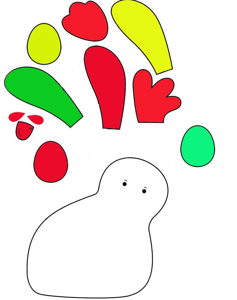Вырежьте два маленьких треугольника из оранжевой бумаги и приклейте их на цыпленка и курицу, как показано на рисунке ниже. Также вырежьте хохолок из красной бумаги и наклейте ее на голову курицы.Черным маркером нарисуйте глаза и лапки.