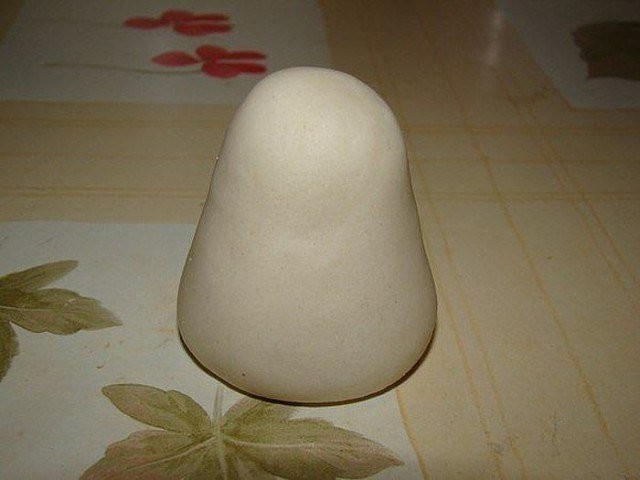 На третьем этапе мы лепим изделие. Делается это на ровной поверхности – дощечка, фанера, плотный картон. Для того чтобы сделать гриб из соленого теста, надо скатать ножку, положить ее на поверхность и немного придавить.