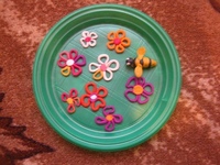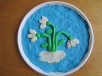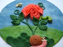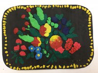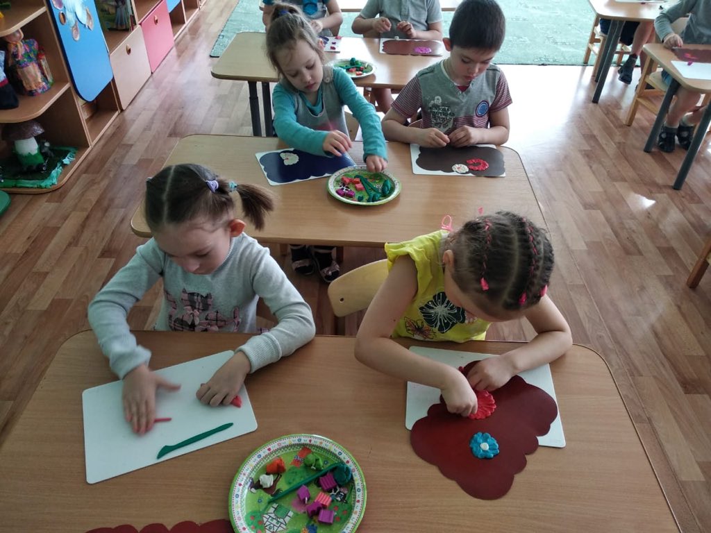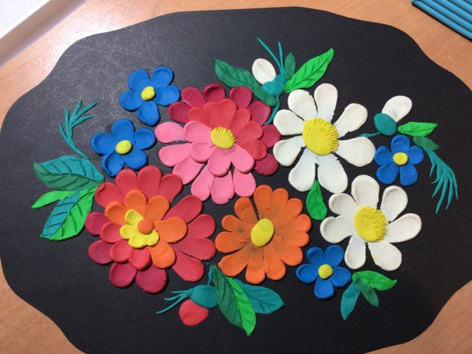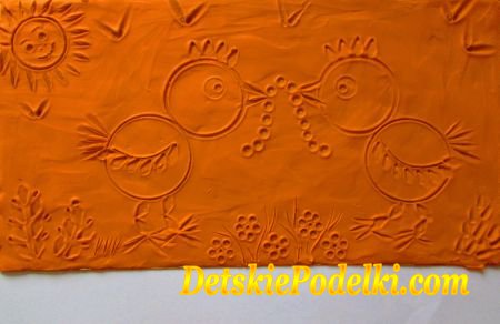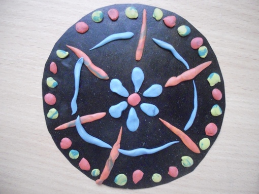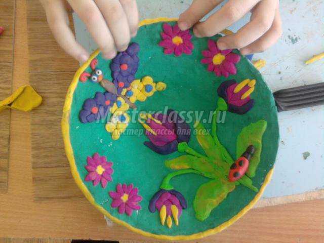 Пластина готова, теперь ее можно украсить путем налепа. Посмотрите, как я накладываю маленькие детали на поверхность пластины и концом стеки прикрепляю их к ней. На сегодня свою работу я закончила. Кто мне подскажет, почему моя работа закончилась?