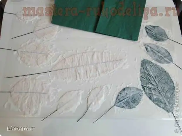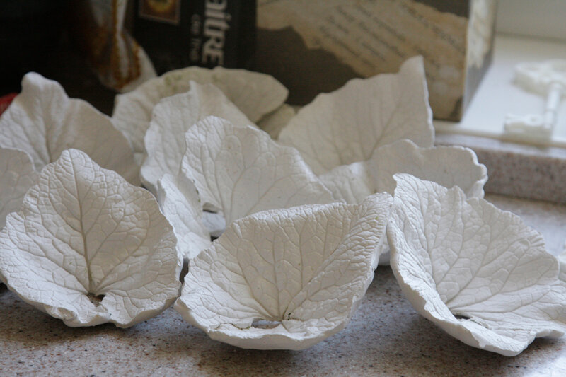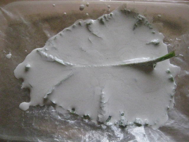 Гипса у меня уже почти нет, а вот алебастр есть. Будем работать с ним. Тем более, что разницы практически никакой нет. Конечно гипс остается белый, а алебастр серый и сохнет алебастр чуть дольше. Я эти листики сушила трое суток.