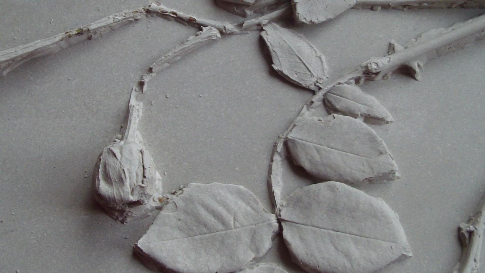 После смешивания гипса берется небольшой кусок материала и раскатывается скалкой, после чего прикрепляется к стене с помощью шликера.Шаблон кладут на гипс и обводят по контуру. С помощью инструментов удаляются излишки материала. Для этих целей можно применять как профессиональные устройства, так и блеклые. Сначала создается контур листа, а затем его середина.
