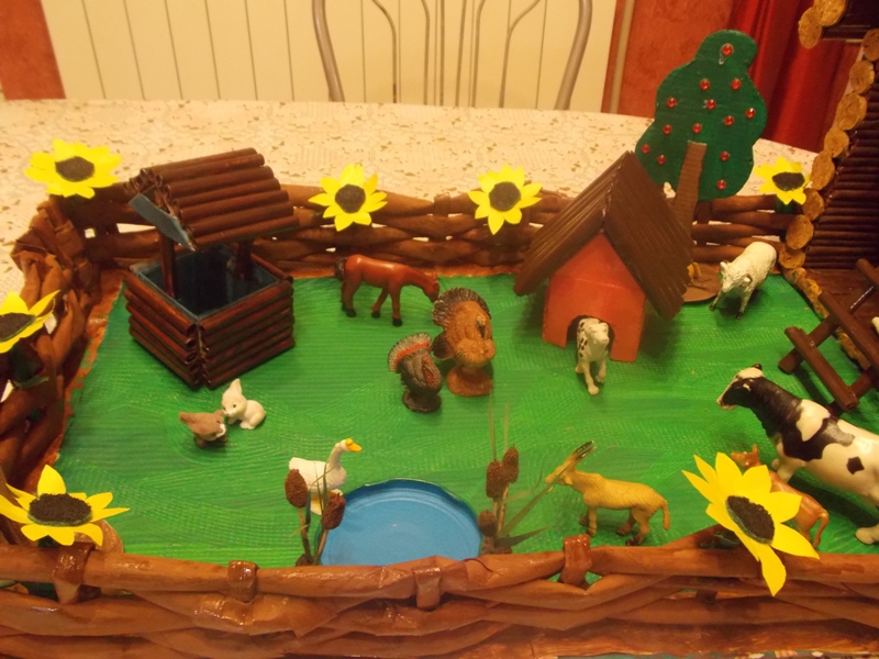 избу из плотного картона, покрыли стены клеем ПВА, потом обсыпали манной крупой и после высыхания вновь покрыли клеем ПВА, имитируя таким образом “мазанку”. Крыша, цоколь и лавочка – картон, оклеяный мешковиной, труба – картонный цилиндр, оклеяный шпагатом. Колодец изготовили