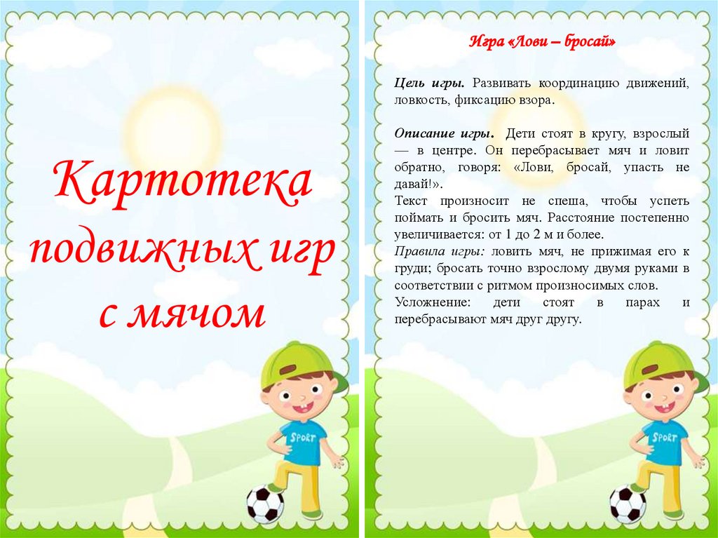 Цель: учить детей подбрасывать мяч вверх, и ловить его двумя руками, не прижимая к груди. Развивать координацию движений, глазомер.