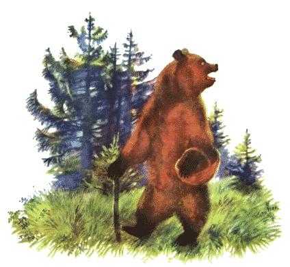 Идёт медведь между ёлками, бредёт медведь между берёзками, в овражки спускается, на пригорки поднимается. Шёл-шёл, устал и говорит: