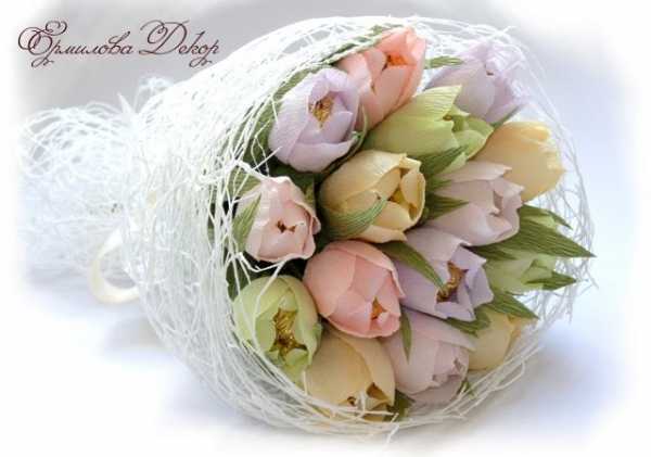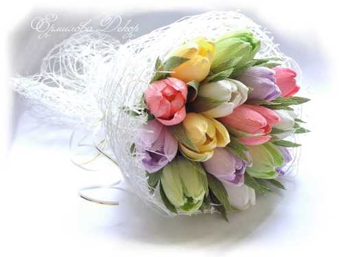 Нежные тюльпаны из гофрированной бумаги с конфетами подойдут для букета по любому поводу и для дамы любого возраста.