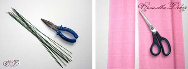 Для начала подготавливаем проволоку. Для это пассатижами отрезаем лишнюю 1/4 часть проволоки. Затем отрезаем длинные полоски гофрированной бумаги.