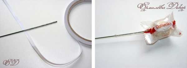 Затем берем нашу укороченную проволоку и конец обматываем скотчем. Упаковку нашей конфеты фиксируем к проволоке.