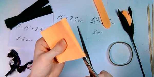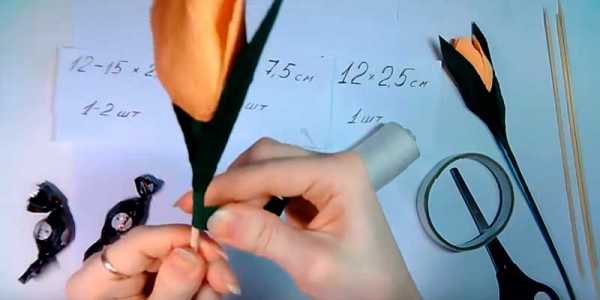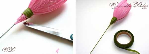 Стебель оберните зеленой полоской шириной 1 см и длиной 10-12 см. Нанесите горячий клей на кончик полоски, приложите ее к основанию цветка и, слегка натягивая, обкрутите стебель по направлению сверху вниз, периодически капая клей на палочку.