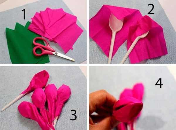 Вам понадобится: гофрированная бумага фиолетово-розового и зелёного цвета, пластиковые ложки, ножницы, линейка, скотч.