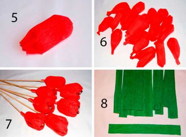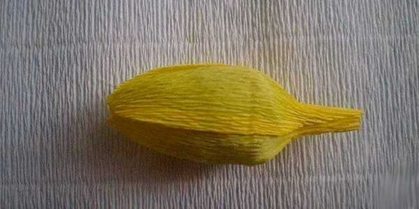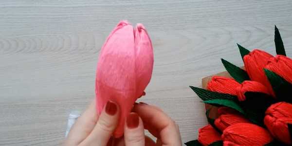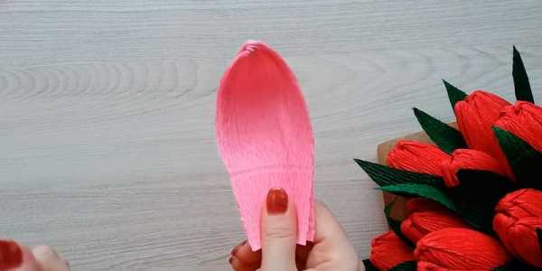 Лепесткам придайте выпуклую форму, растягивая в средней части. Вверху тоже немного растяните гофрированную бумагу, чтобы край лепестков тюльпана получился волнистым.
