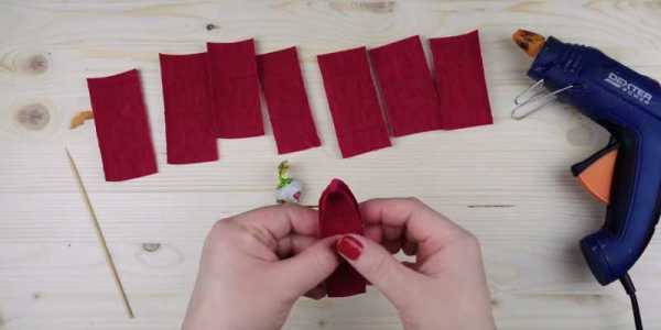 Вокруг заготовки с конфетой поочередно приклеиваем 4 лепестка.