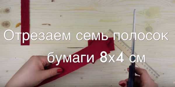 Отрезаем полоску из красной бумаги размеры ее – 16 на 2см. Полоску посередине перекручиваем и складываем пополам.