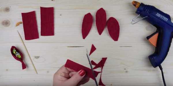 Подготовленные три лепестка добавьте к бутону с конфетой и зафиксируйте в нижней части нитками. Лепестки расположите внахлест по кругу.