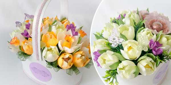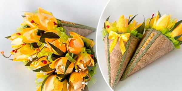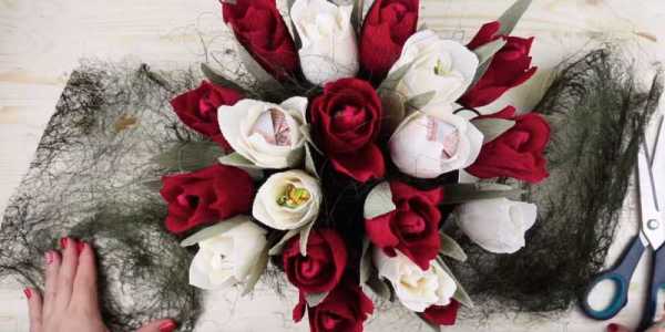 Перед началом работы продумайте, какую цветовую гамму гофрированной бумаги лучше использовать. Заранее определитесь с количеством тюльпанов и создайте изысканный шедевр своими руками. Ещё больше мастер-классов и идей конфетных букетов Вы можете найти в этой статье.