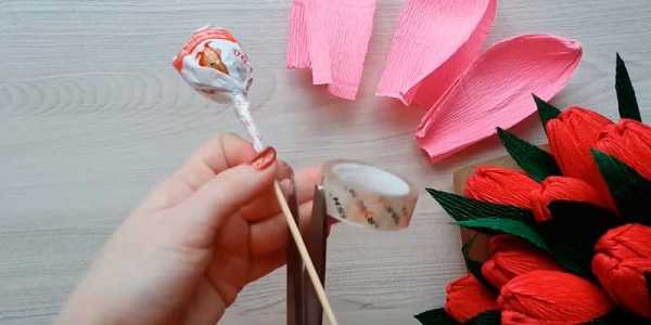 Далее, 2 другие заготовки располагаем возле конфеты, придерживая пальцами. Крепко обматываем тейп-лентой. На первый раз покажется это сложным, но второй тюльпанчик будет легче.
