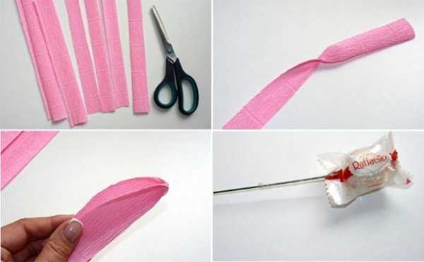 На розовом отрезке 6х8 см вверху вырежьте три крупных зубчика примерно на треть высоты и растяните пальцами посередине таким образом, чтобы внутрь поместилась конфета.