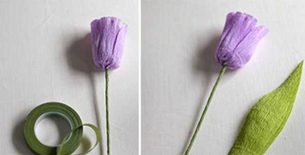 У основания цветка перевязываем полоской из зеленой бумаги. Вырезаем листок. Растягиваем его посерединке.