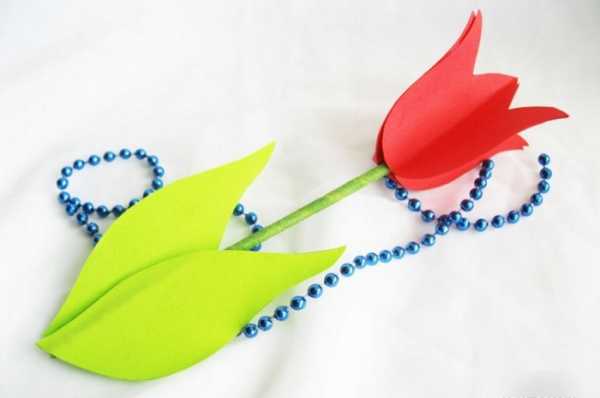 Шашлычную палочку вклейте в середину хвостика с помощью горячего клея, плотно прижмите и дайте клею высохнуть. Срежьте лишнее у основания цветка. Теперь у тюльпана появился стебелек.