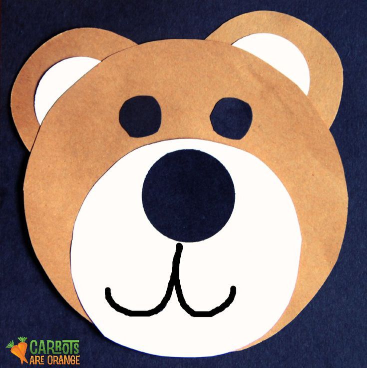 На основе этого же шаблона морды медведя можно сделать поделку из картона уже В ВИДЕ МАСКИ — с прорезями для глаз.