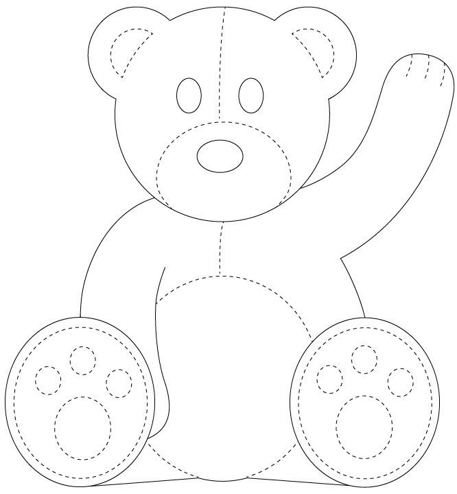 Медведи не обязательно должны быть страшные и лесные — они могут быть обычными ПЛЮШЕВЫМИ ИГРУШКАМИ. Вот несколько шаблонов для аппликаций с ИГРУШЕЧНЫМИ медведями. Как правило игрушечные мишки изображаются в сидячей позе. Вот так…