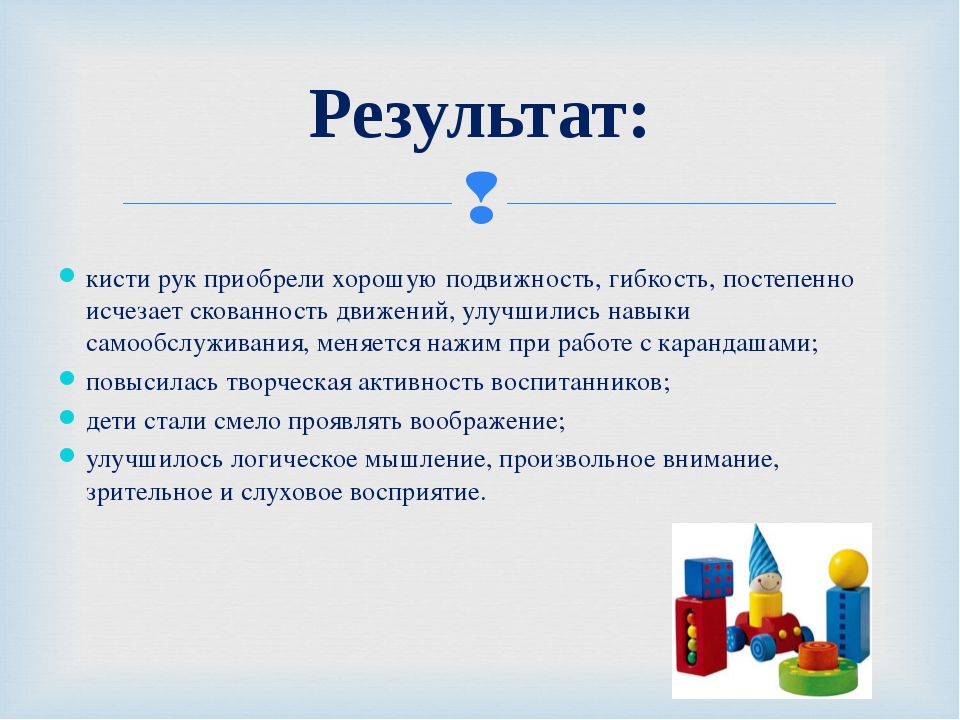 Тренируя пальцы, мы оказываем мощное воздействие на работоспособность коры головного мозга, что в дальнейшем сказывается на подготовке руки к письму, рисованию, самообслуживанию.