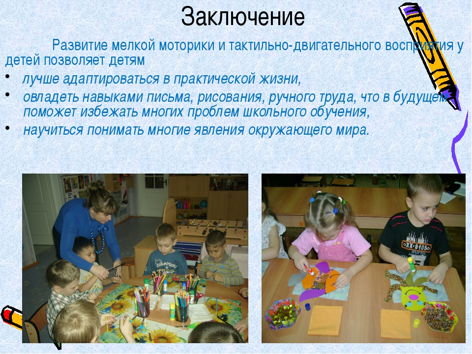 Подводя итог можно, сказать, что целенаправленная и систематическая работа по развитию мелкой моторики у детей дошкольного возраста нетрадиционными методами оказывает положительное воздействие на весь организм в целом, развивает навыки ручной умелости, стимулирует речевое развитие, формирует механизмы, необходимые для будущего овладения письмом. Детям такие методы интересны, они активно в них участвуют, они им нравятся, они получают удовольствие, а получаем наилучшие результаты.