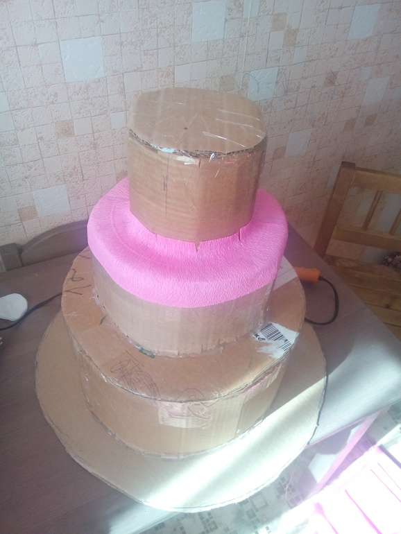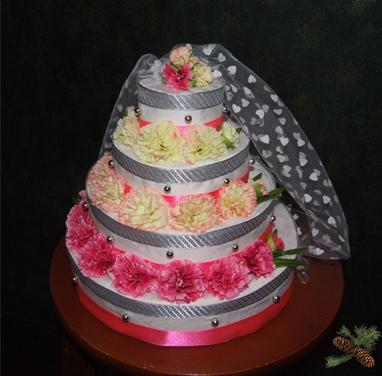 Белые и розовые розочки по кругу приклеиваем на торт,наверху большая красная розочка, Предлагаю в нижнем ярусе торт сделать разрез и вшить замок для сюрприза или призов.