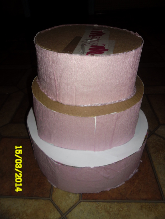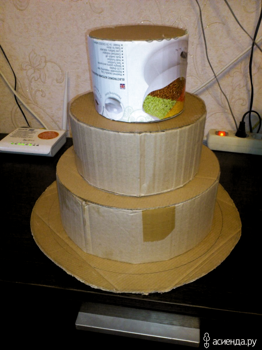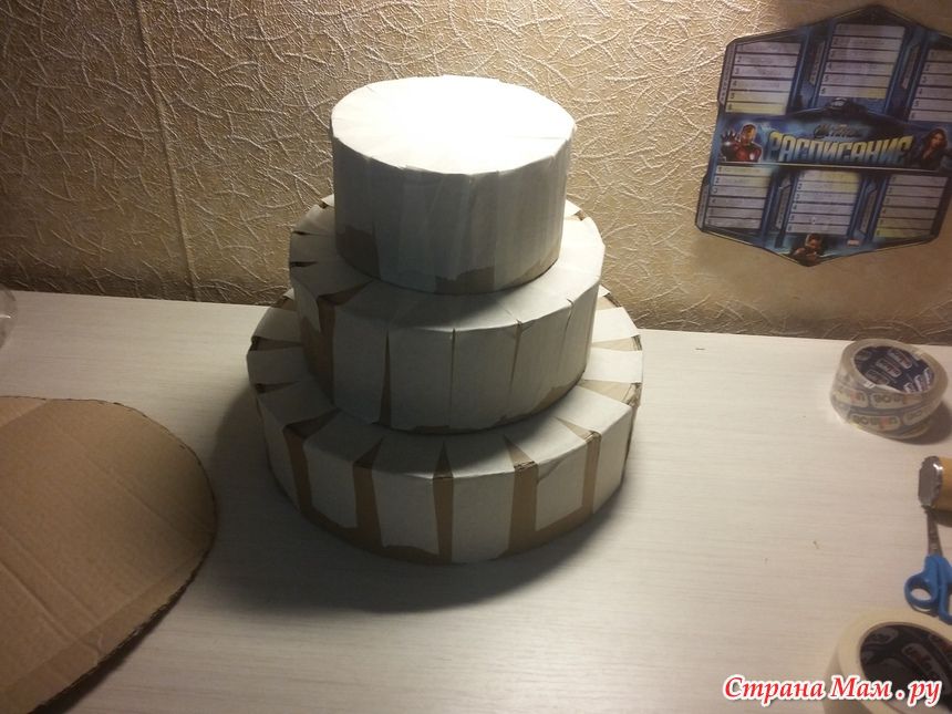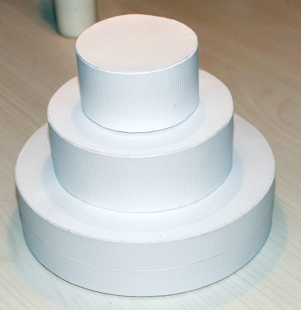 Поместите сумасшедшее количество горячего клея в центр крышек и начните собирать свой «торт» из ярусов коробок.