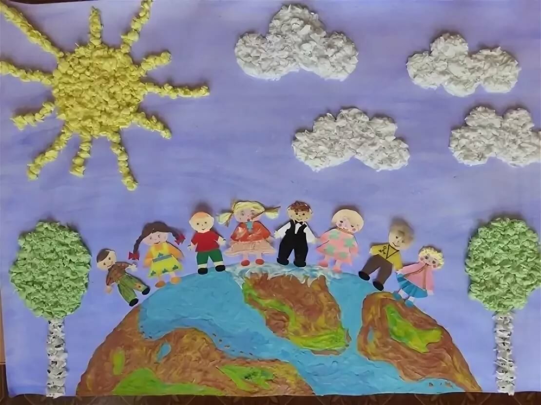 На мой взгляд, очень в тему будет изобразить счастливых детей с разных уголков нашего земного шара. Они могут держатся за руки, как на этой картинке: