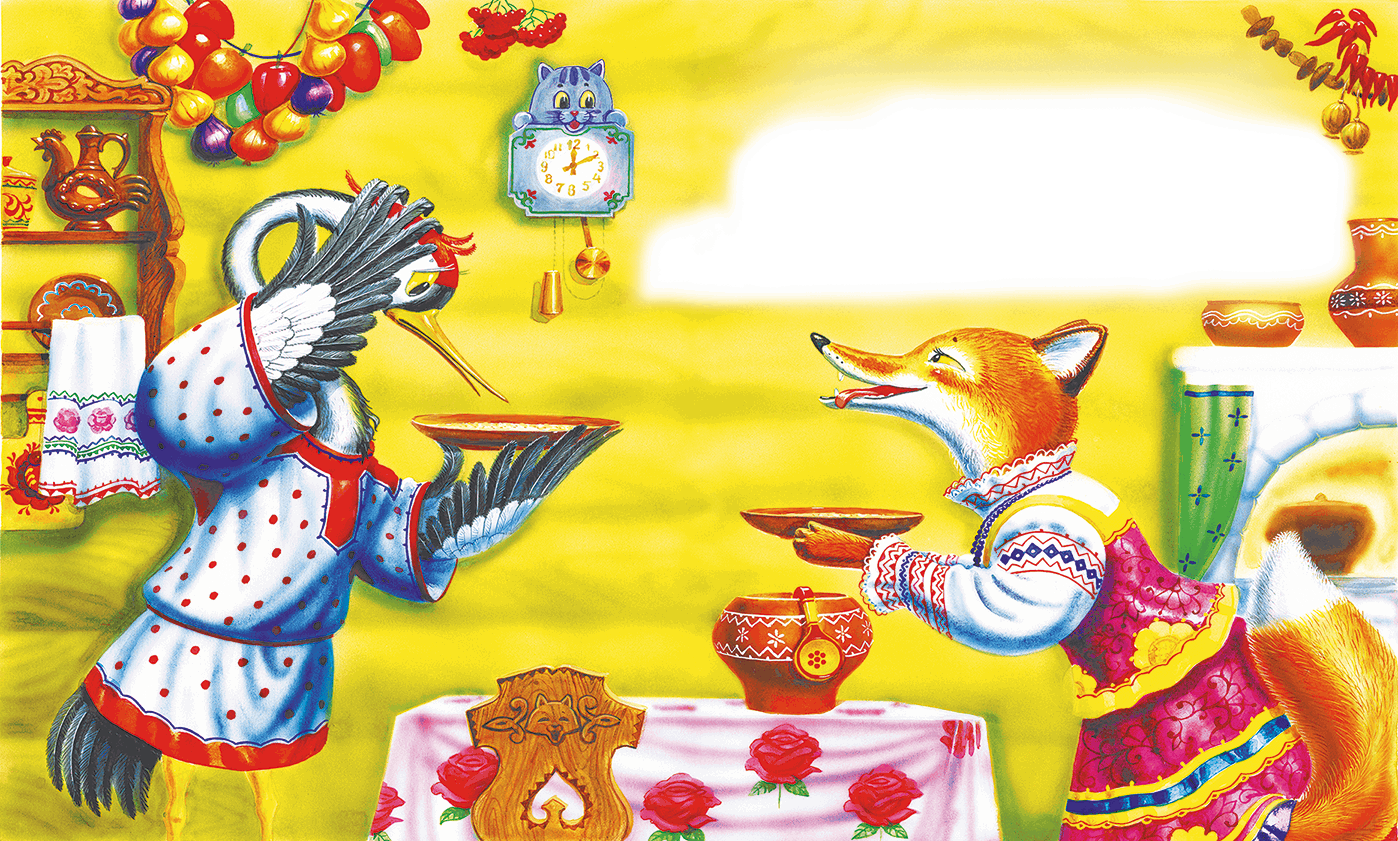 Журавль стук-стук носом по тарелке, стучал, стучал – ничего не попадает! А лисица лижет себе да лижет кашу, так все сама и съела. Кашу съела и говорит: – Не обессудь, куманек! Больше потчевать нечем. Журавль ей отвечает: – Спасибо, кума, и на этом! Приходи ко мне в гости. На другой день приходит лиса к журавлю, а он приготовил окрошку, наклал в кувшин с узким горлышком, поставил на стол и говорит: – Кушай, кумушка! Право, больше нечем потчевать.