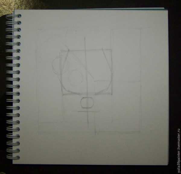 Ну вот мы и нашли общие размеры нашей композиции на листе, теперь разделим ее на размеры отдельных предметов. Да-да, именно так, нам нужно разделить место, выделенное для всей композиции, на места для предметов, из которых она состоит. Здесь снова-таки работает наш неутомимый глазомер.