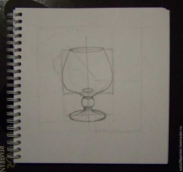 Затем уже выделяем яблоко, веточку и прямоугольник фужера. Конечно, это скучный урок. Но если вы построите таким образом несколько натюрмортов, например, 2-3 простых и 3-4 сложных, то все будет уже строится в голове, все пропорции будут складываться сами по себе.